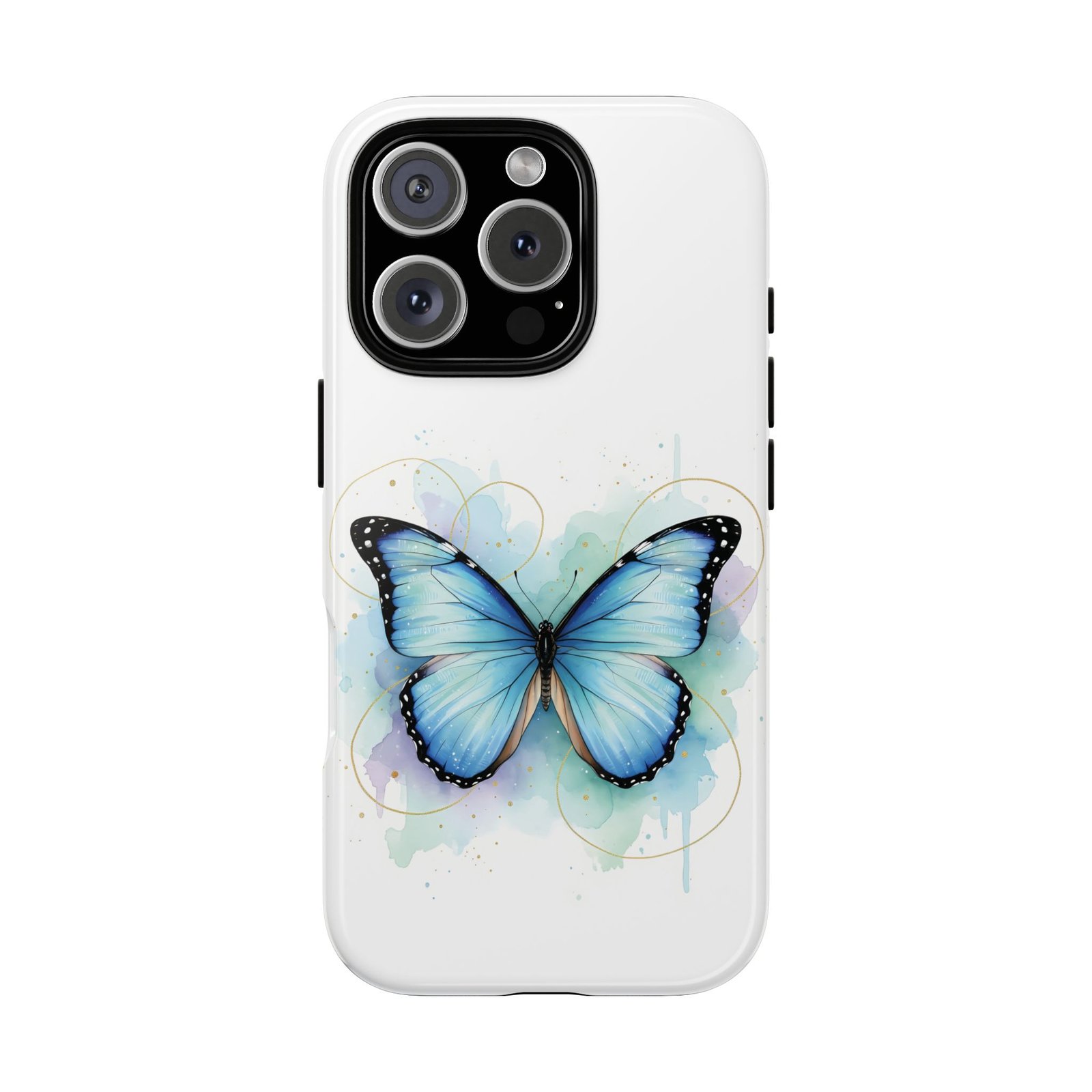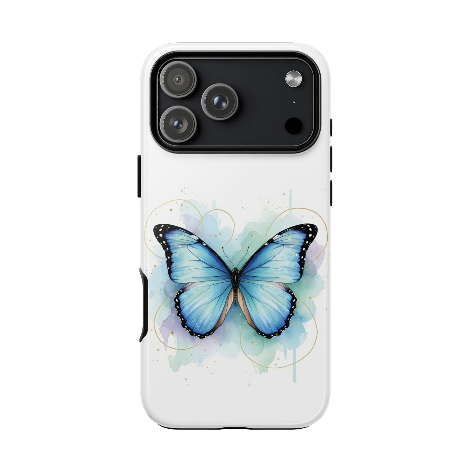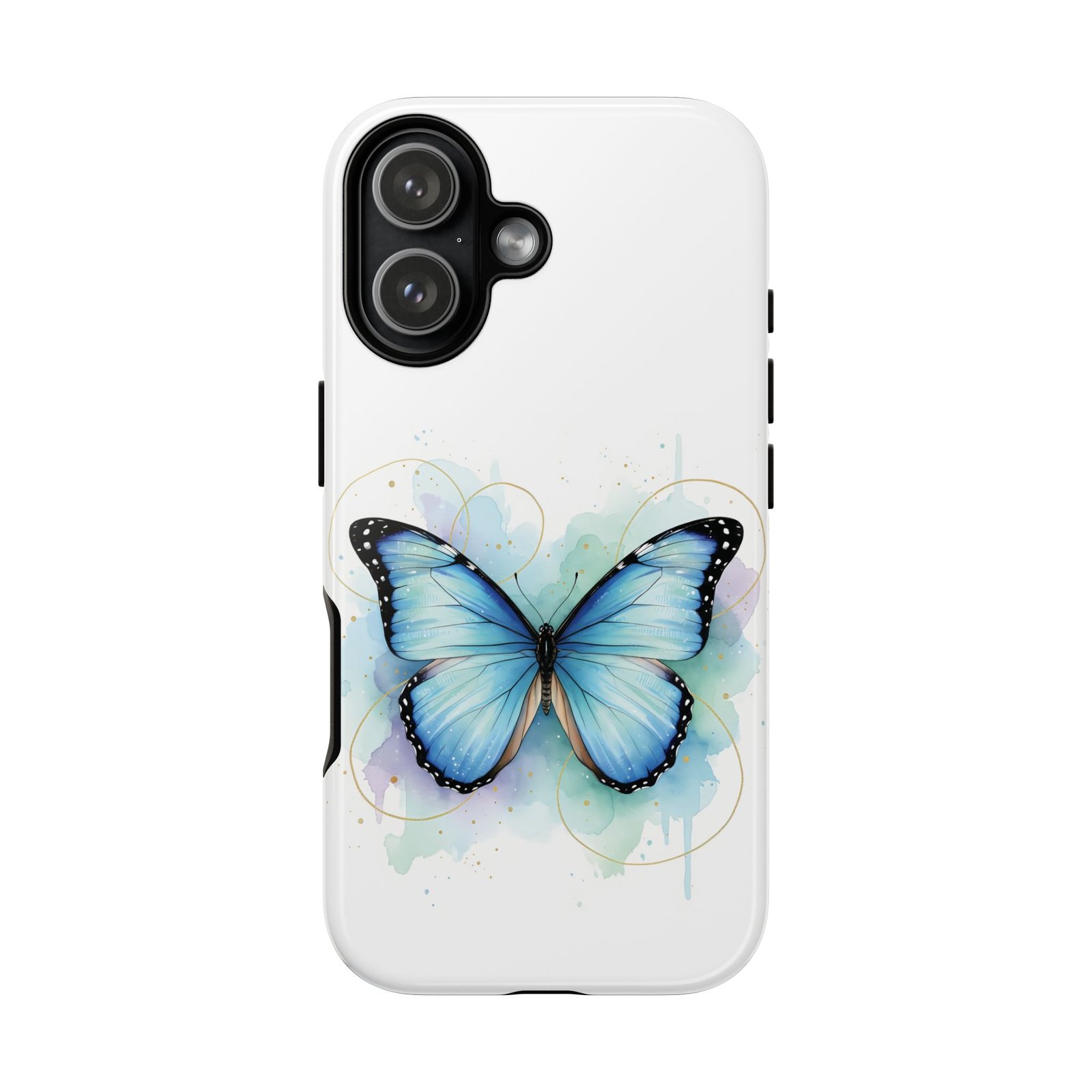 This protective phone case wraps your device in a soft, watery painterly scene—centered on a luminous blue butterfly with delicate, inked edges. The dual-layer construction (polycarbonate shell + TPU silicone liner) cushions drops and absorbs shocks while the full-wrap 3D print keeps the artwork visible across the curve of the case. Finished in your choice of glossy or matte, the case resists outdoor fading with UV protection and leaves ports and wireless charging accessible. Subtle, elegant, and built to travel with you, it feels like carrying a small, serene moment in your pocket every day.